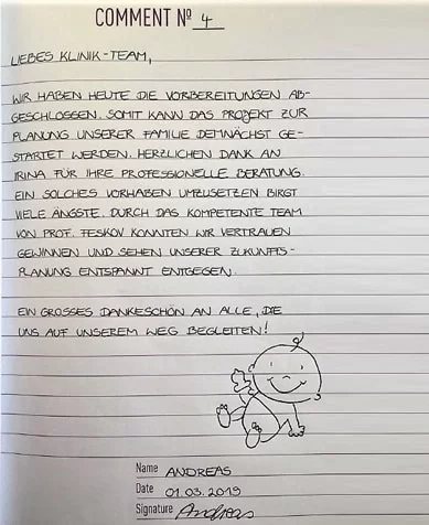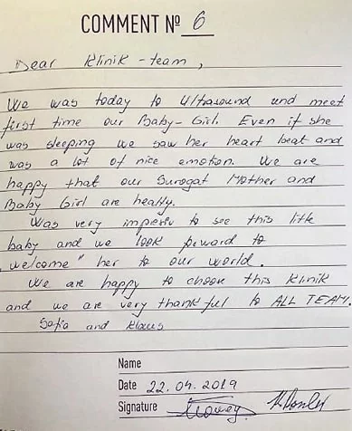 ¡Agradecemos a todos nuestros clientes por ser abiertos, por sus comentarios y opiniones sobre nuestro trabajo! Tratamos con mucho respeto a las personas que están listas para hablar sobre la subrogación, compartir su historia y ejemplo, de tal modo dando esperanza a otras parejas.