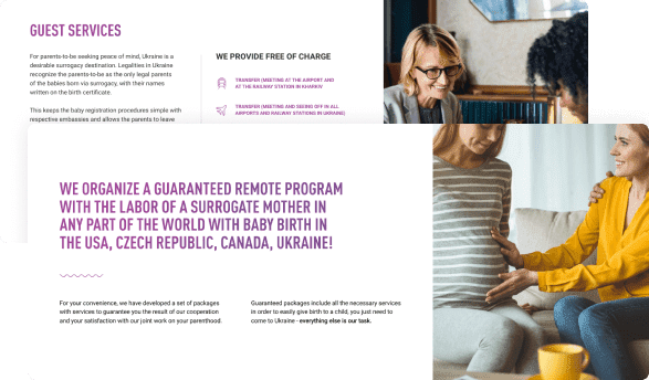 La tarea clave de nuestra agencia de maternidad subrogada consiste en providenciar el ciclo completo de servicios hasta el nacimiento de un bebé sano, incluyendo la selección de los mejores óvulos de donantes y la garantía de su compatibilidad con los padres previstos, la elaboración de un plan individualizado de servicios legales, los servicios de alojamiento y atendimiento a los huéspedes. Todos estos servicios visan garantizar el máximo confort a nuestros clientes. Pero de todos modos, nuestra máxima prioridad es la medicina. Una vez iniciado el proceso, basado en sus demandas y expectativas, hacemos nuestro mejor esfuerzo para lograr una óptima compatibilidad y contribuir a su paternidad despejada y feliz.
